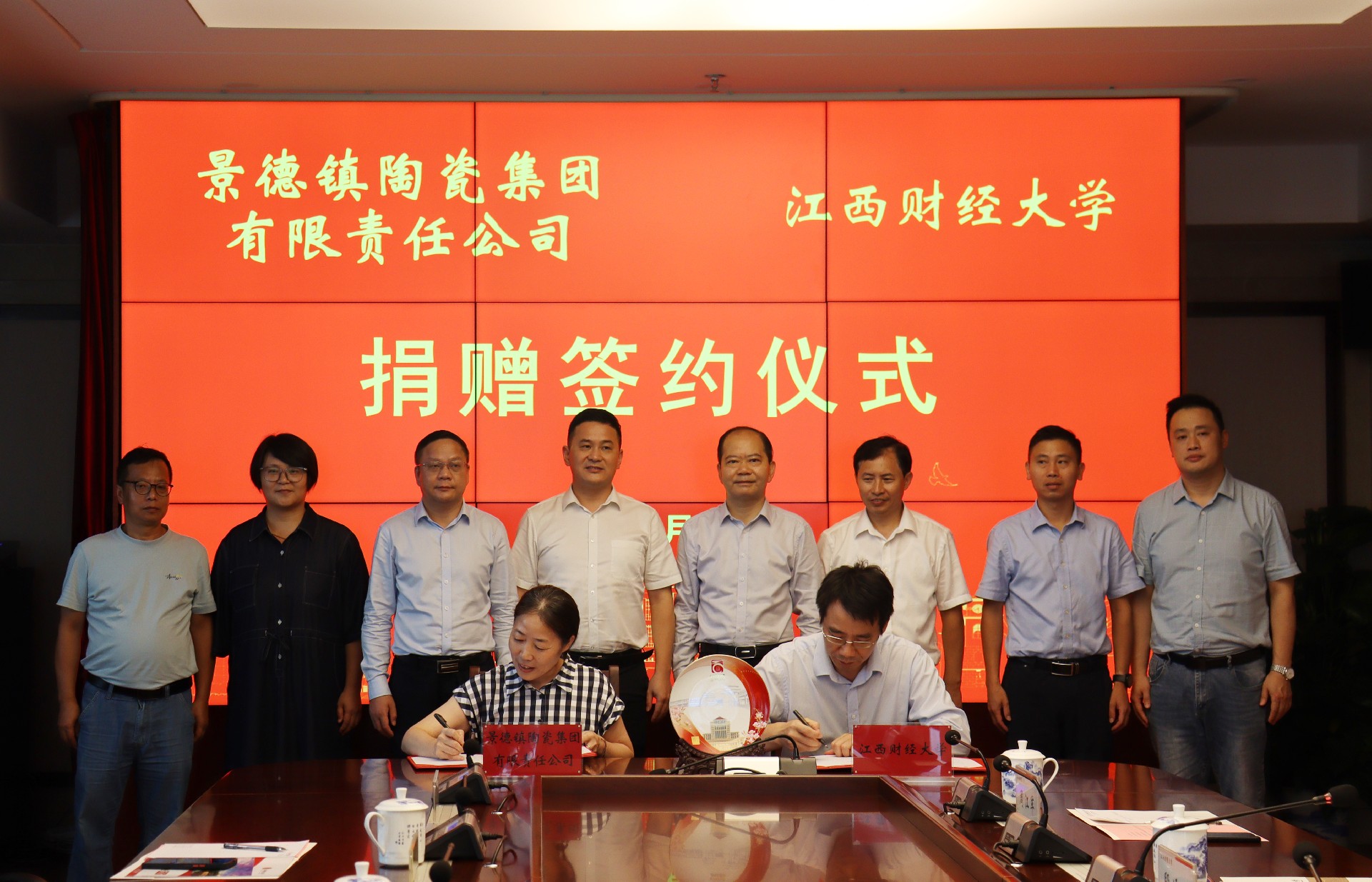 簽約儀式(shi)上(shang),吳愛云代表(biao)景(jing)陶集(ji)團與江西財(cai)經大學簽署捐贈協議(yi),并(bing)捐贈紀念瓷盤,鄧景(jing)揚(yang)代表(biao)景(jing)陶集(ji)團接受(shou)江西財(cai)大頒發的《捐贈證書》。