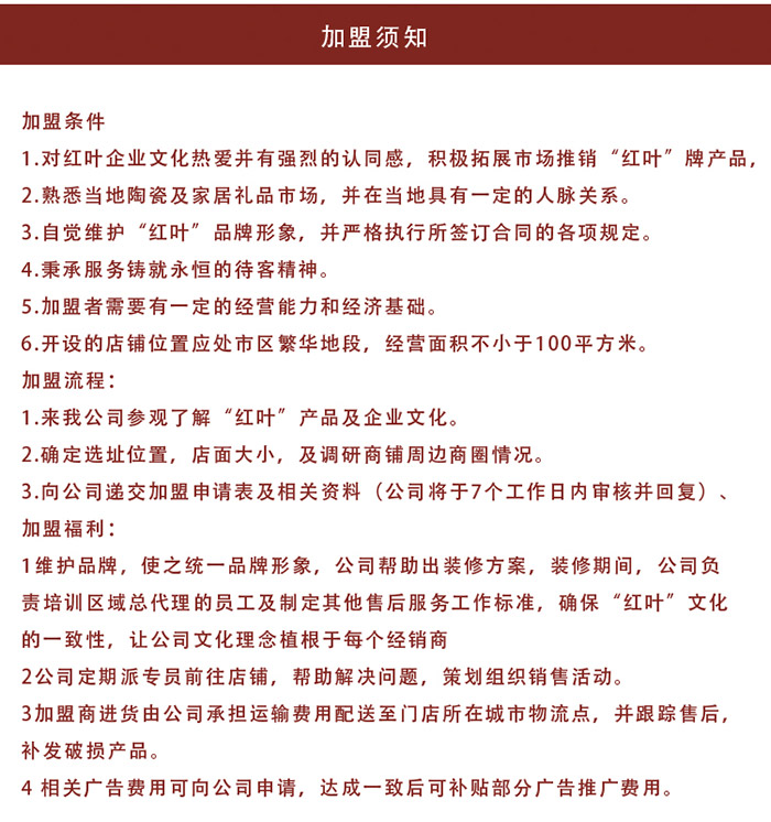 良禽擇木而棲,我們熱(re)忱歡迎各界熱(re)愛紅(hong)(hong)葉陶瓷(ci)且備(bei)具(ju)一定(ding)經濟實力的(de)有(you)志之士(shi),加盟“紅(hong)(hong)葉”,與我們一起共同(tong)創造(zao)景德(de)鎮紅(hong)(hong)葉陶瓷(ci)股份(fen)有(you)限公(gong)司的(de)美好明天。