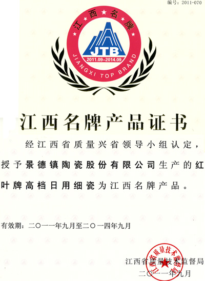 2011年(nian)10月(yue)9日在(zai)南昌召開了2011年(nian)江西名牌產品(pin)及質(zhi)量管理先(xian)進企業授牌大(da)會,“紅葉”陶瓷(ci)榮獲(huo)2011年(nian)江西名牌產品(pin)稱號。