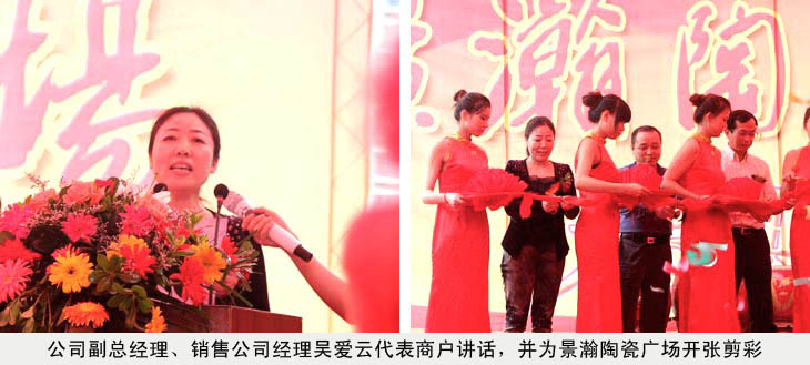 在景(jing)瀚陶(tao)(tao)瓷(ci)廣場(chang)落成開(kai)業(ye)(ye)(ye)慶典儀式上(shang),公(gong)司副(fu)總吳愛(ai)云(yun)受王耀董事長委托(tuo),代(dai)表(biao)景(jing)德鎮陶(tao)(tao)瓷(ci)股(gu)份有(you)限公(gong)司,代(dai)表(biao)紅(hong)葉陶(tao)(tao)瓷(ci)1號店,代(dai)表(biao)所有(you)進駐(zhu)的業(ye)(ye)(ye)主們發言。她說:今天是五星級陶(tao)(tao)瓷(ci)購物天堂——景(jing)瀚陶(tao)(tao)瓷(ci)廣場(chang)開(kai)業(ye)(ye)(ye)的大(da)好日子(zi),受王耀董事長委托(tuo),我僅(jin)代(dai)表(biao)景(jing)德鎮陶(tao)(tao)瓷(ci)股(gu)份有(you)限公(gong)司,代(dai)表(biao)紅(hong)葉陶(tao)(tao)瓷(ci)1號店,代(dai)表(biao)所有(you)進駐(zhu)的業(ye)(ye)(ye)主們,對景(jing)翰陶(tao)(tao)瓷(ci)廣場(chang)的開(kai)業(ye)(ye)(ye)表(biao)示熱烈的祝賀。祝景(jing)瀚陶(tao)(tao)瓷(ci)廣場(chang)開(kai)業(ye)(ye)(ye)大(da)吉,生意興隆。