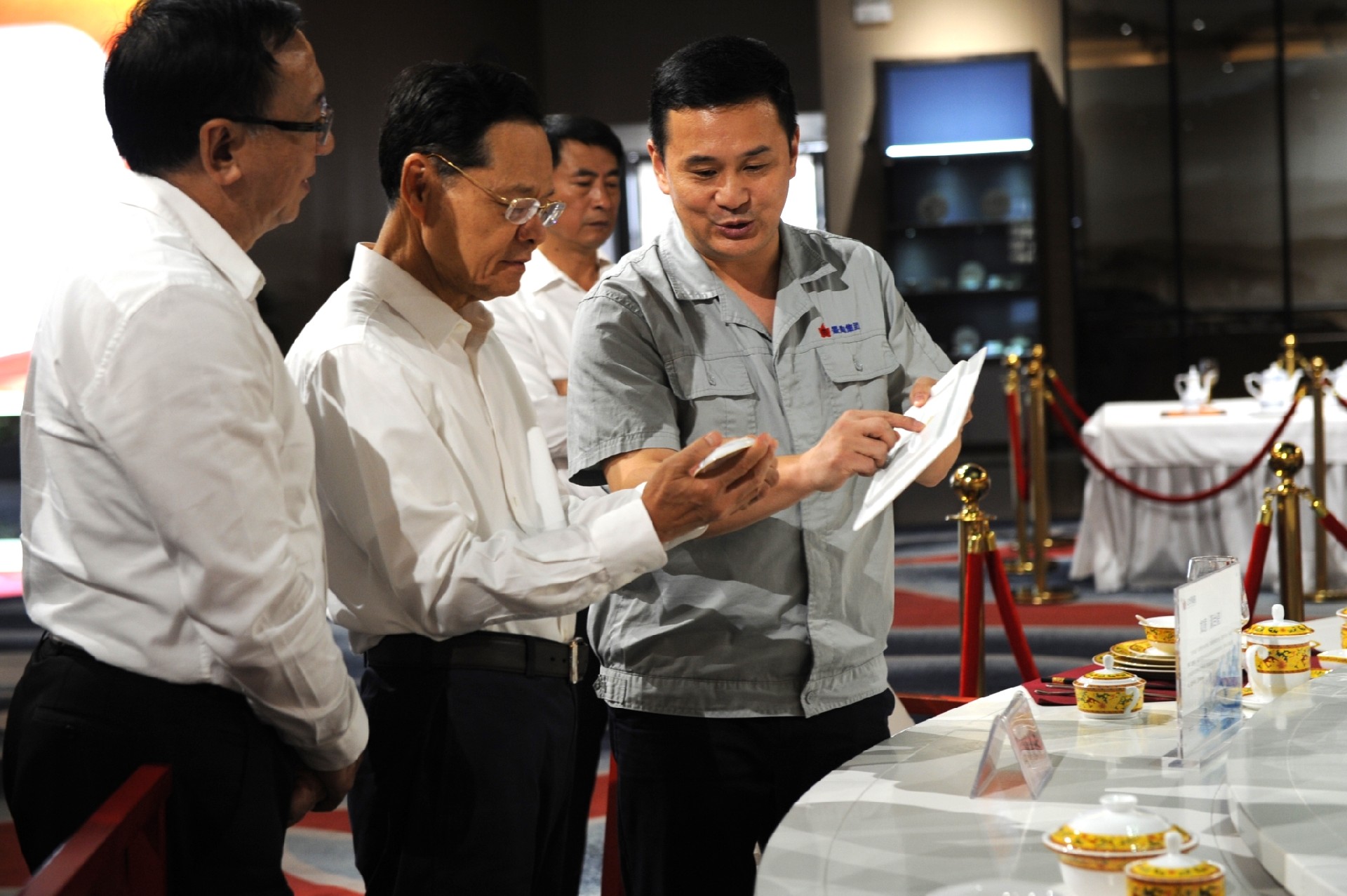 走進國(guo)瓷(ci)(ci)(ci)(ci)館(guan)(guan),鄧(deng)(deng)(deng)景(jing)(jing)(jing)揚(yang)(yang)向(xiang)陳(chen)(chen)武(wu)一(yi)行介紹了(le)集(ji)團的(de)(de)基(ji)本情(qing)況,國(guo)瓷(ci)(ci)(ci)(ci)館(guan)(guan)展(zhan)(zhan)廳(ting)規模。鄧(deng)(deng)(deng)景(jing)(jing)(jing)揚(yang)(yang)介紹說,“國(guo)瓷(ci)(ci)(ci)(ci)館(guan)(guan)”是(shi)目前全世(shi)界(jie)最大的(de)(de)單一(yi)品(pin)(pin)牌(pai)陶(tao)(tao)(tao)(tao)瓷(ci)(ci)(ci)(ci)展(zhan)(zhan)廳(ting)。參觀時,陳(chen)(chen)武(wu)興致勃(bo)勃(bo)地拿起(qi)桌上(shang)的(de)(de)一(yi)套產(chan)品(pin)(pin)仔(zi)細端(duan)詳,鄧(deng)(deng)(deng)景(jing)(jing)(jing)揚(yang)(yang)適時介紹到:“這(zhe)是(shi)我們(men)新開發的(de)(de)一(yi)款產(chan)品(pin)(pin),是(shi)一(yi)套組合(he)餐(can)具,該產(chan)品(pin)(pin)將日(ri)用(yong)陶(tao)(tao)(tao)(tao)瓷(ci)(ci)(ci)(ci)和(he)藝術陶(tao)(tao)(tao)(tao)瓷(ci)(ci)(ci)(ci)巧妙結合(he),合(he)起(qi)來是(shi)一(yi)個(ge)花瓶(ping)的(de)(de)造型。”“這(zhe)個(ge)不(bu)錯,有創意!是(shi)紅(hong)(hong)(hong)葉(xie)品(pin)(pin)牌(pai)嗎(ma)?”陳(chen)(chen)武(wu)問道。“這(zhe)是(shi)我們(men)集(ji)團旗下(xia)一(yi)個(ge)“百(bai)花”品(pin)(pin)牌(pai)的(de)(de)產(chan)品(pin)(pin)。”隨即,鄧(deng)(deng)(deng)景(jing)(jing)(jing)揚(yang)(yang)向(xiang)陳(chen)(chen)武(wu)介紹了(le)景(jing)(jing)(jing)陶(tao)(tao)(tao)(tao)集(ji)團發展(zhan)(zhan)脈(mo)絡和(he)以“國(guo)瓷(ci)(ci)(ci)(ci)紅(hong)(hong)(hong)葉(xie)”為主打品(pin)(pin)牌(pai),金品(pin)(pin)陶(tao)(tao)(tao)(tao)、百(bai)花、家好系統(tong)品(pin)(pin)牌(pai)特(te)色,集(ji)聚綻放的(de)(de)特(te)點。期(qi)間,鄧(deng)(deng)(deng)景(jing)(jing)(jing)揚(yang)(yang)講述了(le)“紅(hong)(hong)(hong)葉(xie)”與“御窯”前世(shi)今生的(de)(de)關(guan)系和(he)如何(he)將“紅(hong)(hong)(hong)葉(xie)”產(chan)業和(he)陶(tao)(tao)(tao)(tao)瓷(ci)(ci)(ci)(ci)文(wen)化進一(yi)步做(zuo)大做(zuo)強制定(ding)的(de)(de)新的(de)(de)發展(zhan)(zhan)愿(yuan)景(jing)(jing)(jing)。鄧(deng)(deng)(deng)景(jing)(jing)(jing)揚(yang)(yang)介紹道,“我們(men)集(ji)團的(de)(de)發展(zhan)(zhan)愿(yuan)景(jing)(jing)(jing)是(shi)做(zuo)世(shi)界(jie)上(shang)最精美的(de)(de)瓷(ci)(ci)(ci)(ci)器(qi),創百(bai)年一(yi)流企業,讓(rang)‘紅(hong)(hong)(hong)葉(xie)’成為世(shi)界(jie)知名(ming)的(de)(de)日(ri)用(yong)陶(tao)(tao)(tao)(tao)瓷(ci)(ci)(ci)(ci)中國(guo)民(min)族品(pin)(pin)牌(pai),用(yong)陶(tao)(tao)(tao)(tao)瓷(ci)(ci)(ci)(ci)講好中國(guo)故事,展(zhan)(zhan)中華文(wen)化風采,讓(rang)‘紅(hong)(hong)(hong)葉(xie)’成為中華文(wen)化走向(xiang)世(shi)界(jie)的(de)(de)文(wen)明使者(zhe)。”陳(chen)(chen)武(wu)聽后表示十分(fen)認可(ke)和(he)贊(zan)同(tong),并勉勵(li)景(jing)(jing)(jing)陶(tao)(tao)(tao)(tao)集(ji)團進一(yi)步發揮好景(jing)(jing)(jing)德鎮陶(tao)(tao)(tao)(tao)瓷(ci)(ci)(ci)(ci)龍頭企業的(de)(de)帶頭作用(yong),讓(rang)紅(hong)(hong)(hong)葉(xie)陶(tao)(tao)(tao)(tao)瓷(ci)(ci)(ci)(ci)真正(zheng)走出去。