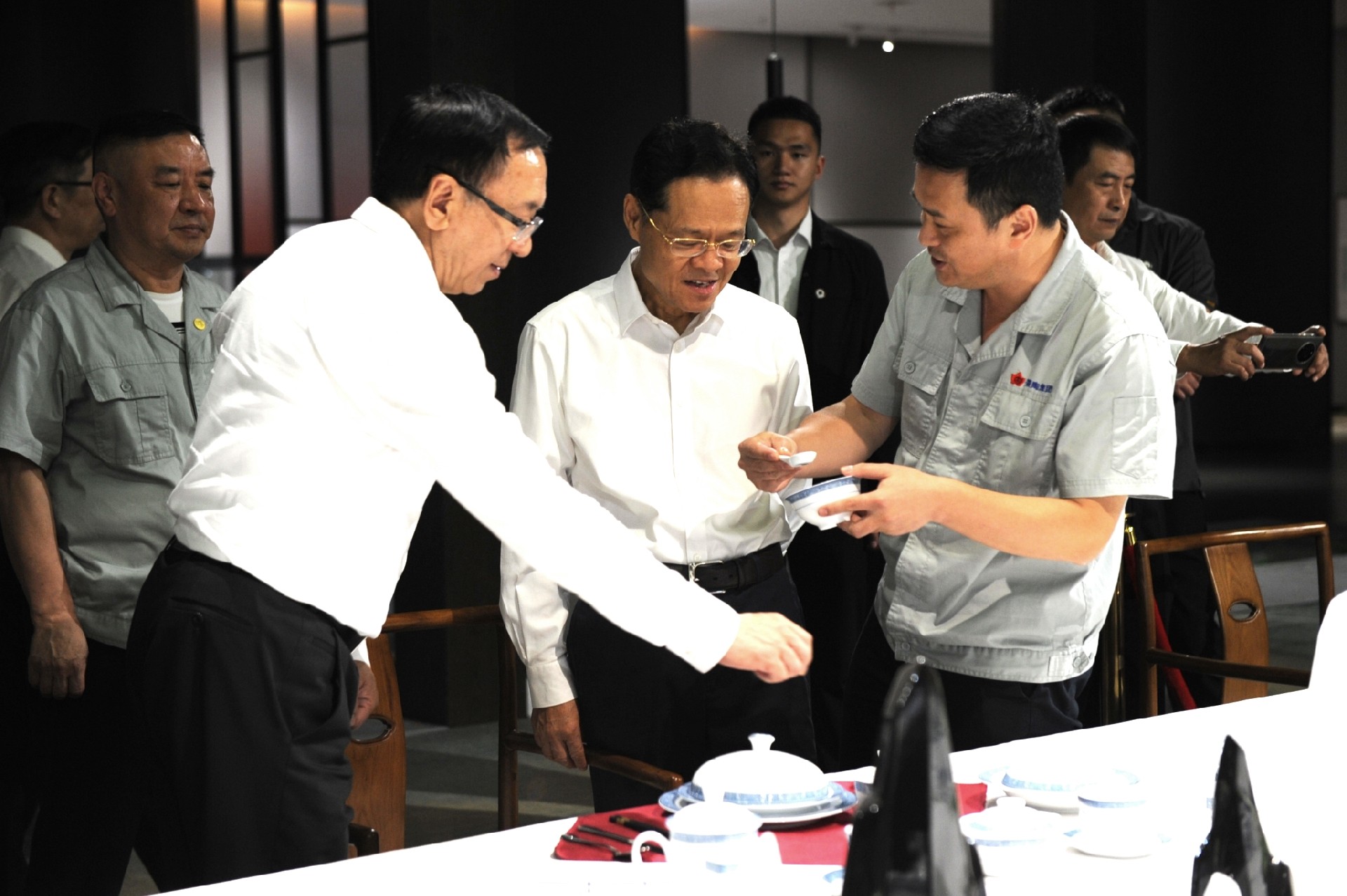 在國瓷館展廳,鄧景揚向陳武介紹了紅葉陶瓷產品特色和先進制瓷工藝,重點講述了一系列“國瓷”“國禮”故事。陳武對精美的產品給予高度評價。