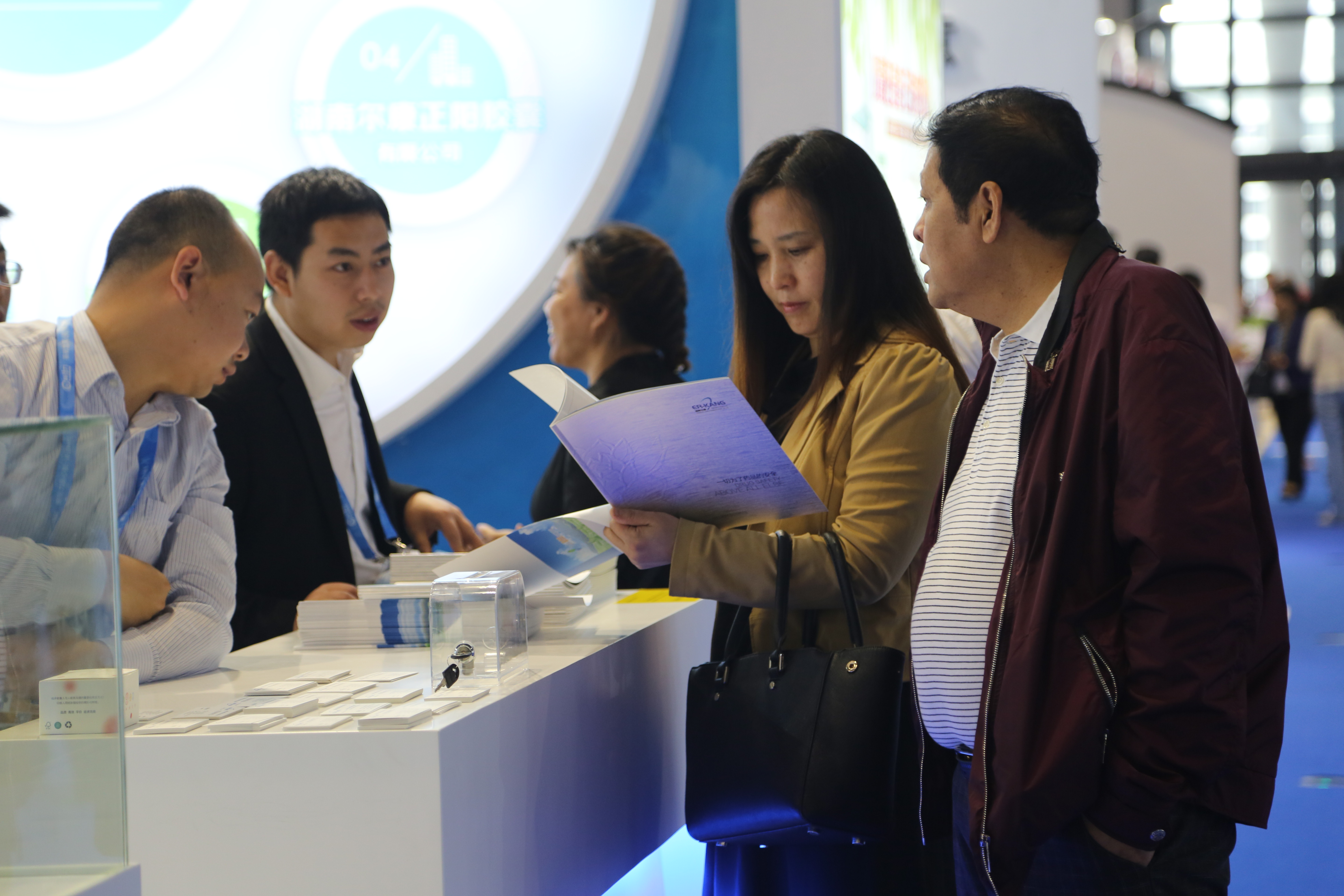 一進(jìn)入上海國(guó)家會(huì)展中心大門,爾康制藥藍(lán)白簡(jiǎn)約風(fēng)格的展廳就映入眼簾,百余平方米的展廳內(nèi)整齊擺放著近三十套桌椅,展臺(tái)上井然有序的陳列著參展產(chǎn)品,四十余名工作人員精神煥發(fā),用心接待每一位客戶,努力讓每一位客戶滿意。